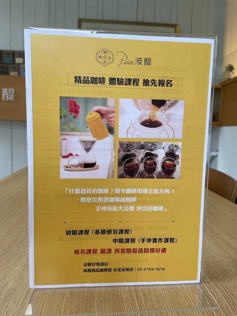 帶著非常滿足的心情離開波醍咖啡安和店,結帳時我才發現他們每個月都定期會開精品咖啡的初階課程,以及手沖的進階課程,兩個課程都是3小時,雖然都酌收些費用,但是現場可以喝幾支不同品項的精品咖啡,同時還可以帶掛耳或咖啡豆回去,真的是物超所值,我馬上就報名了!